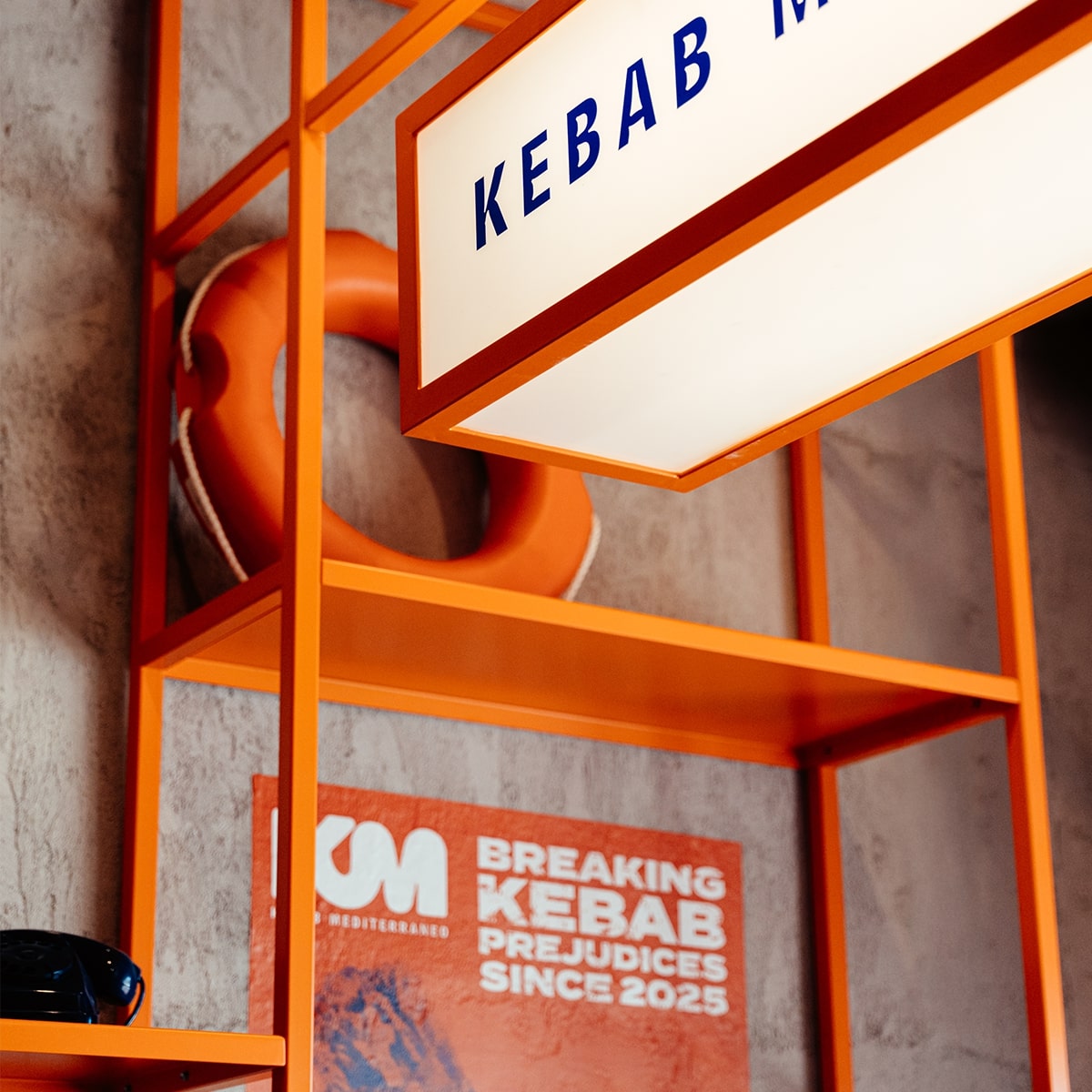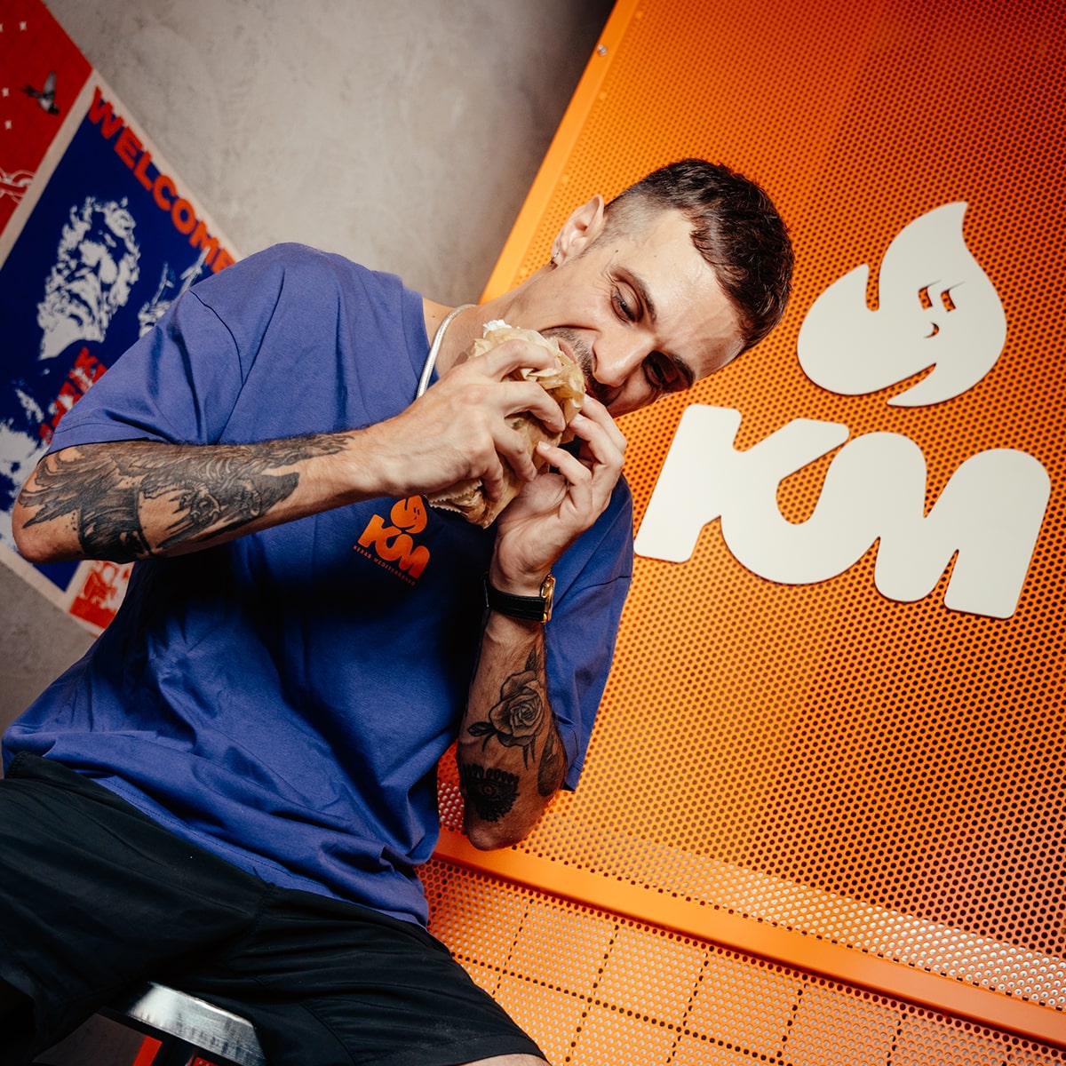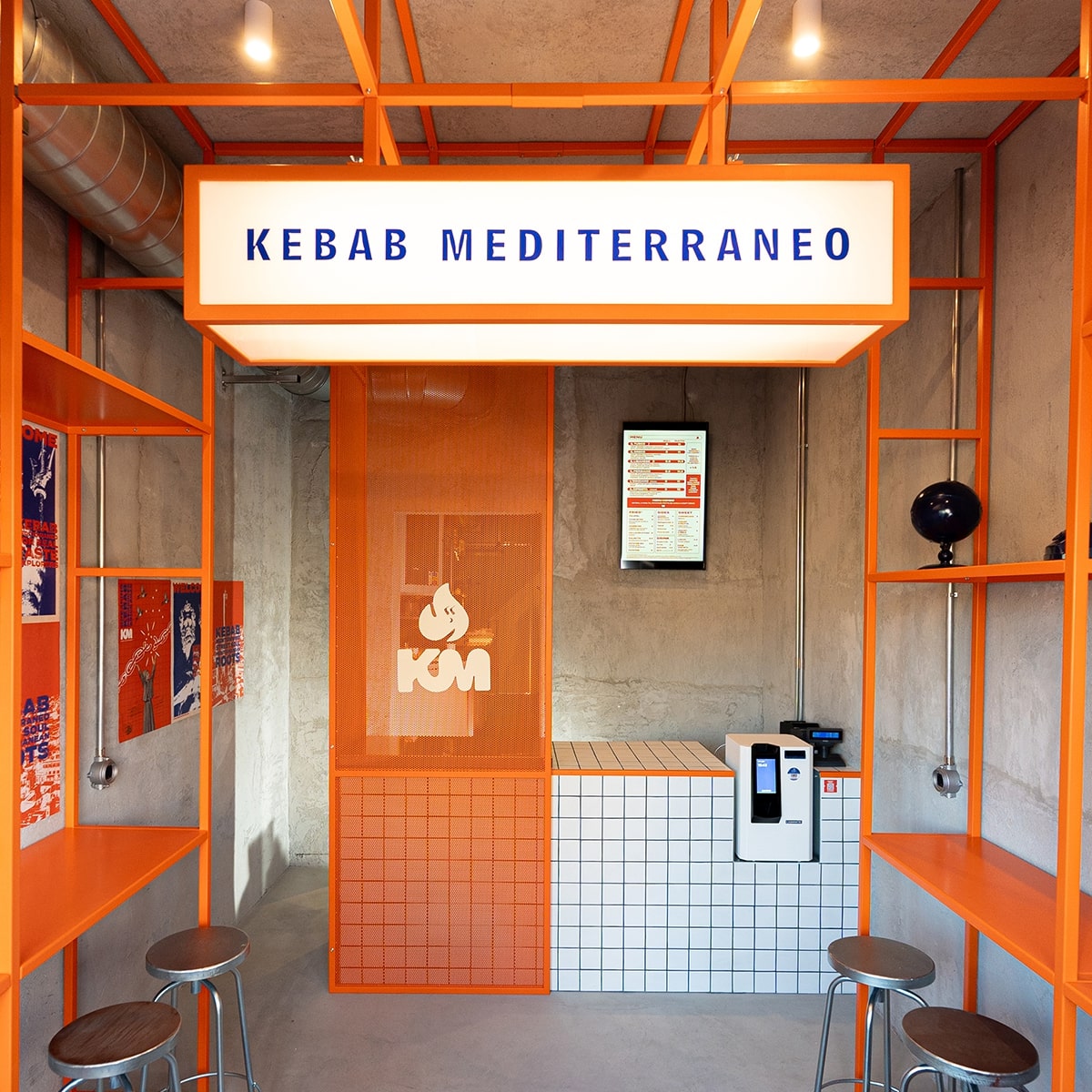 Lo spazio richiama l’estetica berlinese dove il kebab ha avuto la sua esplosione urbana: stile industrial con muri grezzi, ferro colorato arancio, dettagli blu mare, banco rivestito in piastrelle bianche e blu. Un’atmosfera fresca e metropolitana, che racconta un Mediterraneo contemporaneo e aperto.